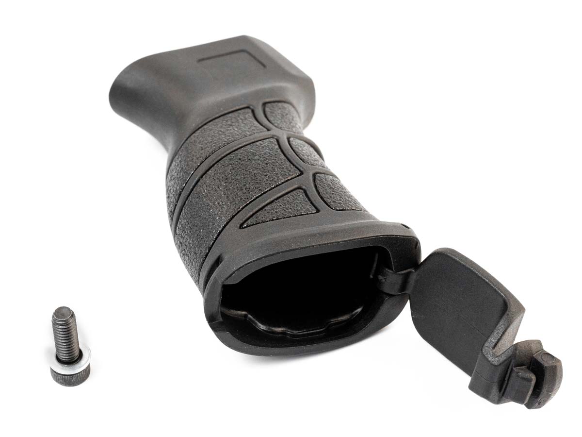 Рукоятка удобно ложится в ладонь, снижая нагрузку на кисть стрелка. Внутри находится отсек с откидывающейся крышкой для хранения мелких аксессуаров.