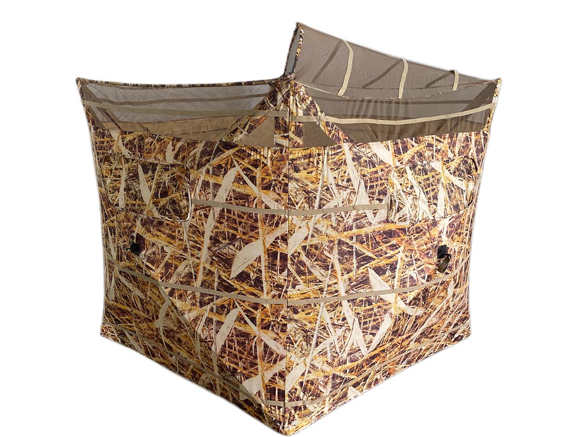 Габариты подходят для комфортного размещения до двух охотников. Легкосборная конструкция позволяет быстро установить засидку на месте проведения охоты. Обзор 360 градусов. Сшита из ткани 300D с водоотталкивающей пропиткой. Имеются стропы для крепления дополнительной маскировки из местной растительности. Комплектуется чехлом с лямками для переноски.