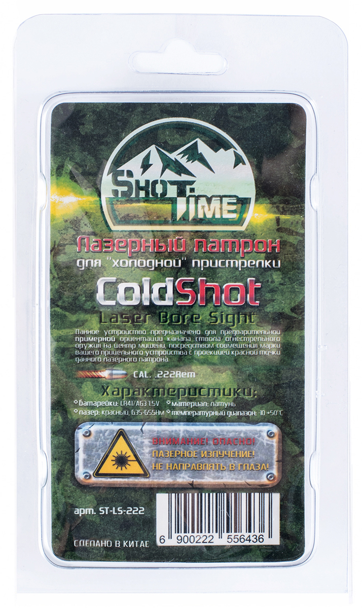Лазерный патрон ShotTime ColdShot кал. .222Rem, материал - латунь, лазер - красный, 635 - 655нМ, температурный диапазон - от -10 до +50°C, батарейки – LR41 или AG3, 1.5V.