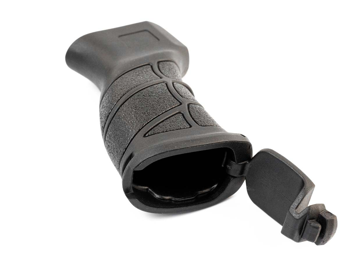 Рукоятка удобно ложится в ладонь, снижая нагрузку на кисть стрелка. Внутри находится отсек с откидывающейся крышкой для хранения мелких аксессуаров.
