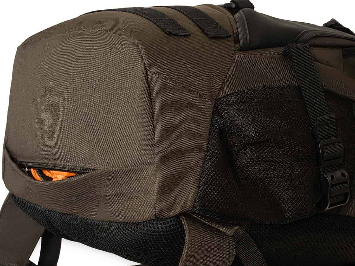 - На передней части рюкзака расположен регулируемый эластичный крепёж из неопрены, предназначенный для фиксации шлема или других вещей, что позволяет удобно закрепить предмет снаружи